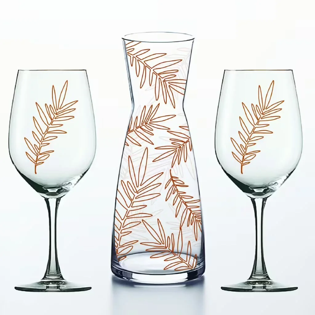 Elaine Swann Feathered Sprigs Glassware Collection ~ 17oz Carafe & Wine Glass 3 Piece Set