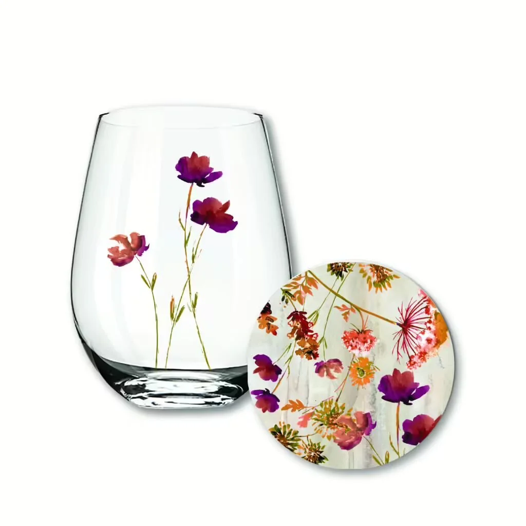 Elaine Swann Rustic Bloom Collection ~ 16oz Stemless Wine Glass and Coaster Set